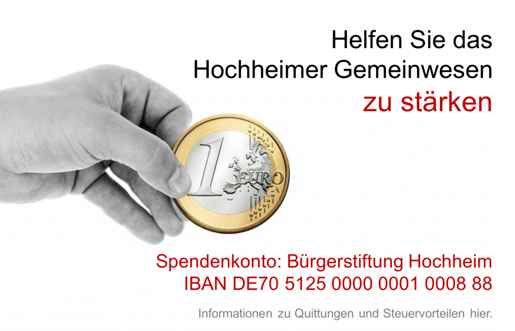 P.S.: Als Betriebswirt und Steuerberater habe ich mit Hochheim im Herzen und Ideen im Gepäck die BÜRGERstiftung Hochheim so konzeptioniert, daß jede kleine und natürlich jede umfangreichere Spende den direkten Weg zu dem von Ihnen geförderten Projekt findet. Mir war und ist wichtig, daß das interessante Instrument der Bürgerstiftung, richtig, hoch flexibel, unbürokratisch und dadurch nachhaltig aufgebaut ist. Dies ist gelungen, wie die vielen erfolgreich umgesetzten Projekte beweisen.